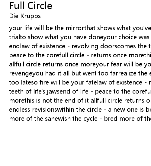 your life will be the mirrorthat shows what you've becomethe stage is set for trialto show what you have doneyour choice was to be rottenso painful be the endlaw of existence - revolving doorscomes the teeth of life's jawsend of life - peace to the corefull circle - returns once morethis is not the end of it allfull circle returns once moreyour fear will be your shadowand life will take revengeyou had it all but went too farrealize the end is nearregrets come much too lateso fire will be your fatelaw of existence - revolving doorscomes the teeth of life's jawsend of life - peace to the corefull circle - returns once morethis is not the end of it allfull circle returns once moreremake, remodel - endless revisionswithin the circle - a new one is bornyou're not alone - there's more of the sanewish the cycle - bred more of the same |