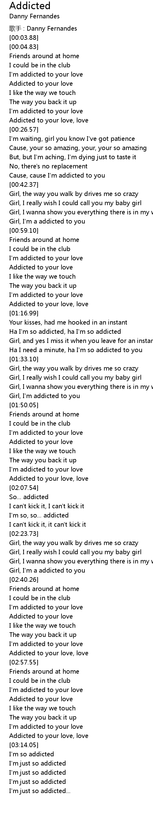 | [00:55.21] | Girl, I'm a addicted to you |