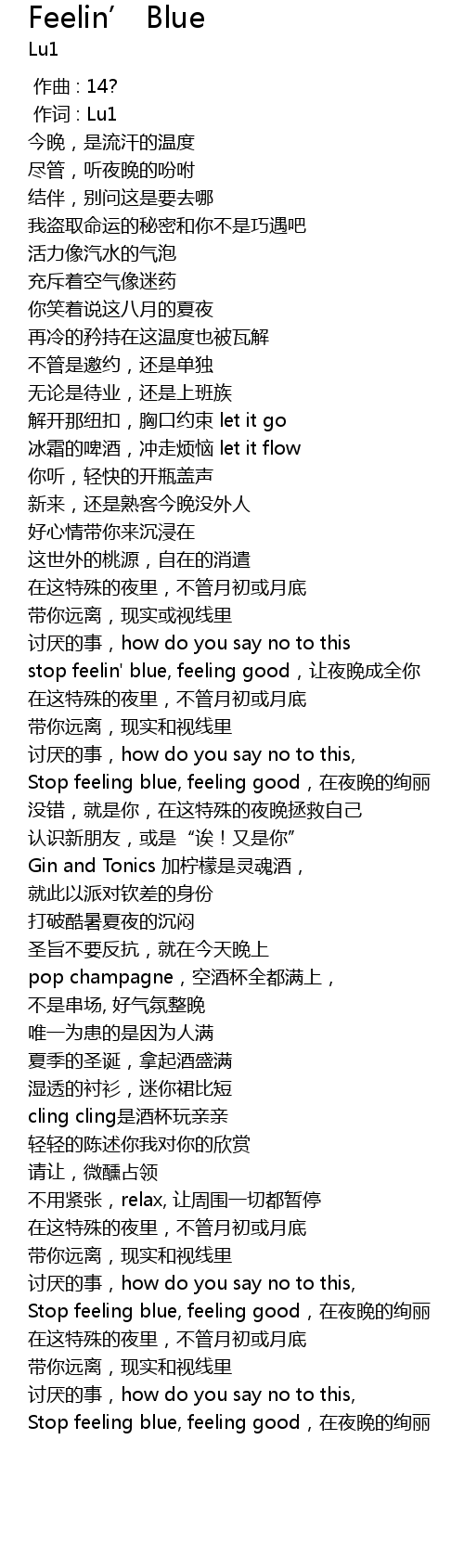 | [01:10.08] | stop feelin' blue, feeling good, ràng yè wǎn chéng quán nǐ |