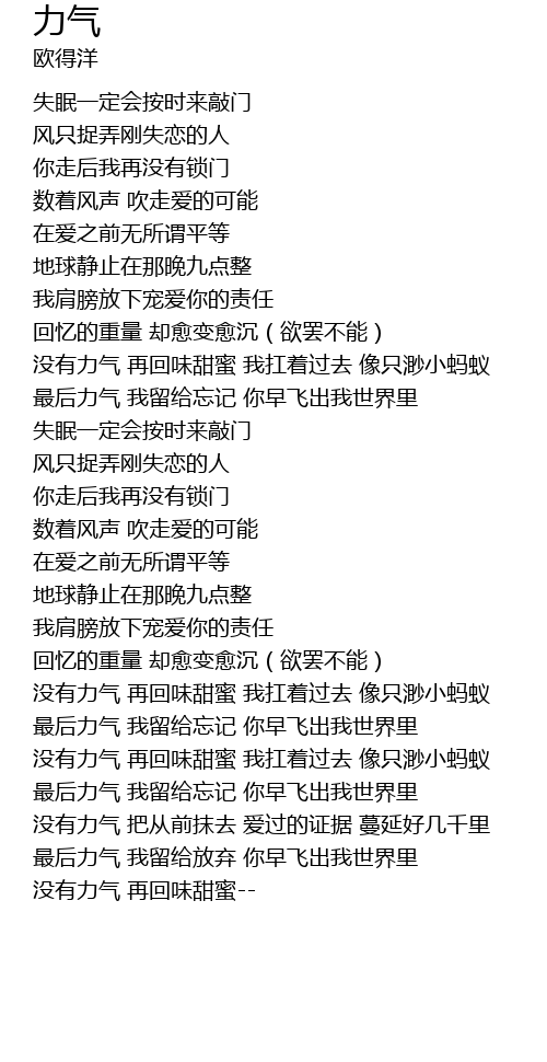 | [02:22.110] | 最后力气 我留给忘记 你早飞出我世界里 |