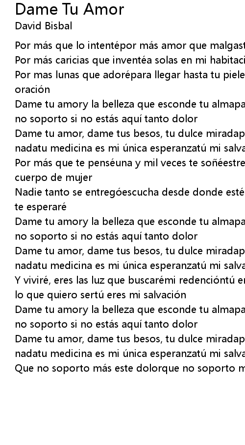| Dame tu amor, dame tus besos, tu dulce miradapor que sin ti cari o no soy nadatu medicina es mi u nica esperanzatu mi salvacio n | |
