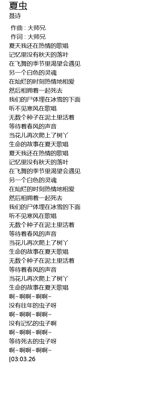 | [03:18.00][03:03.26] | 夏天歌唱的虫子啊 |