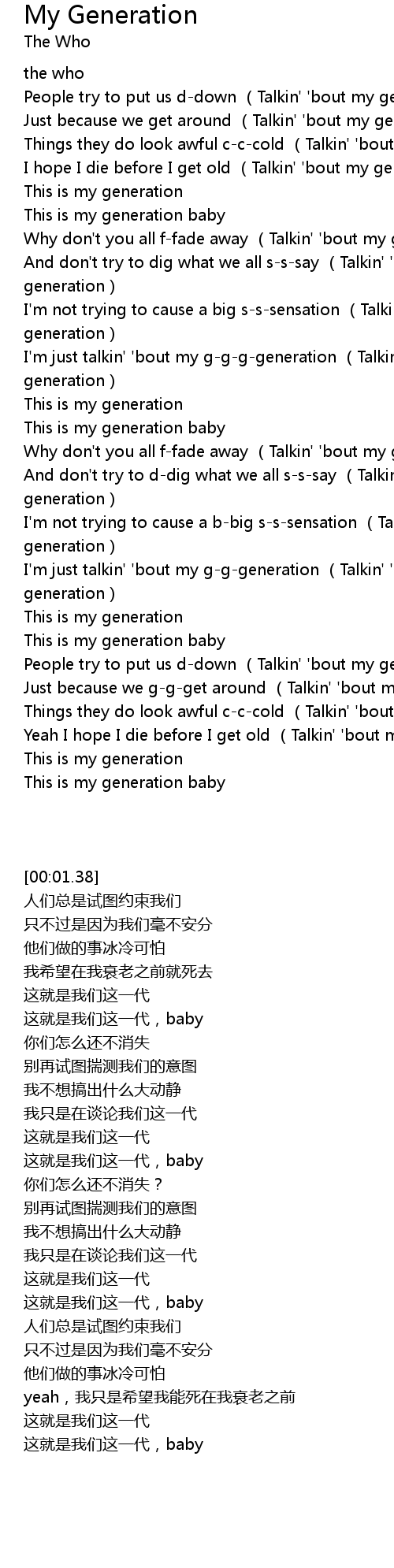 | [01:23.57] | And don't try to d-dig what we all s-s-say (Talkin' 'bout my generation) |