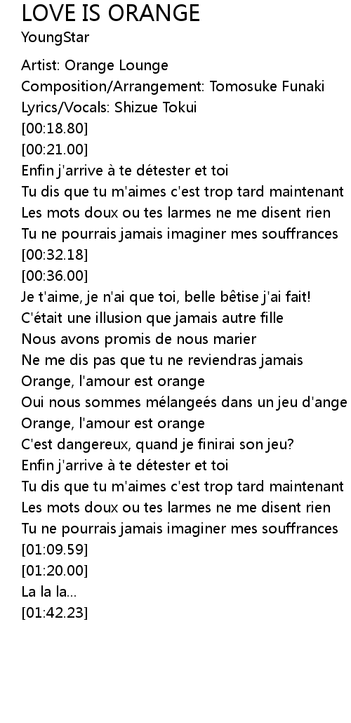 | [00:23.99] | Tu dis que tu m' aimes c' est trop tard maintenant |