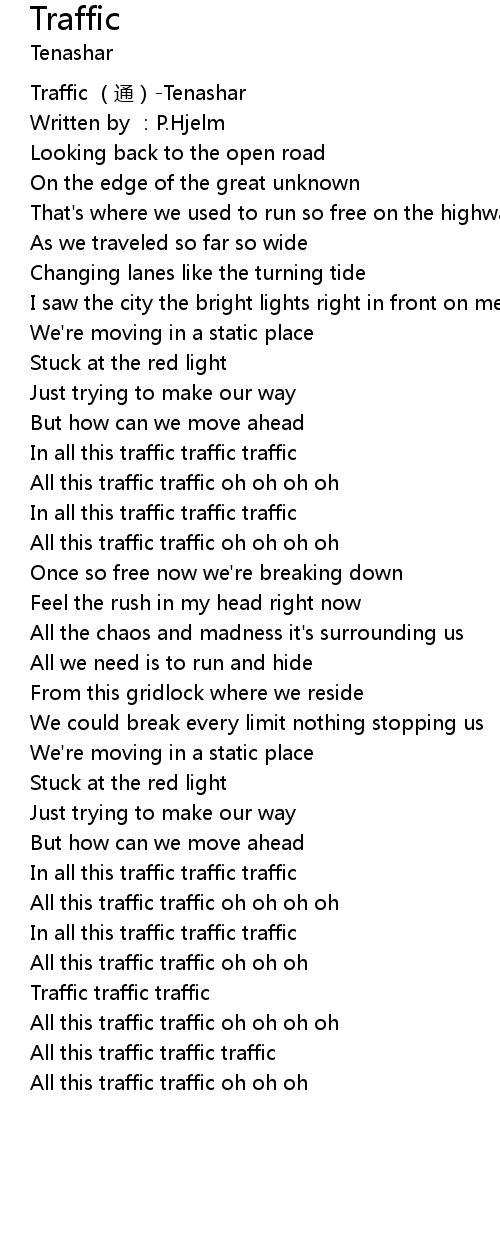 | [01:10.531] | All this traffic traffic oh oh oh oh |