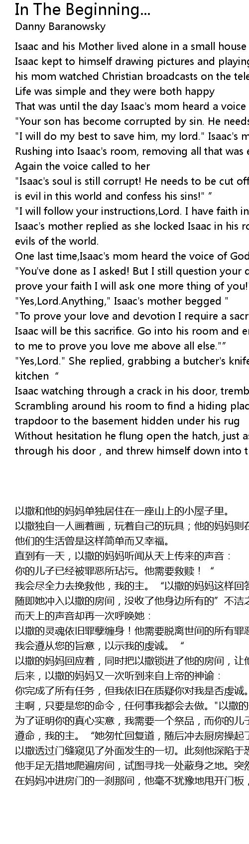 | [01:27.810] | "To prove your love and devotion I require a sacrifice. Your son Isaac will be this sacrifice. Go into his room and end his life as an offering to me to prove you love me above all else."” |
