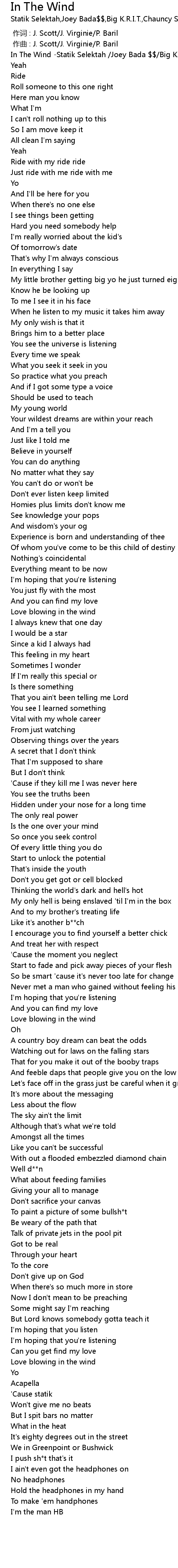 | [00:00.00] | In The Wind -Statik Selektah /Joey Bada $$/Big K.R.I.T./Chauncy Sherod |