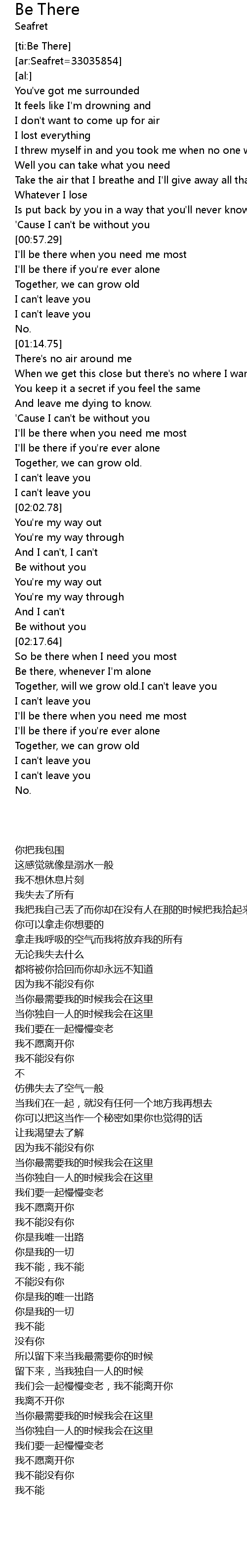| [02:16.68] | Be without you |