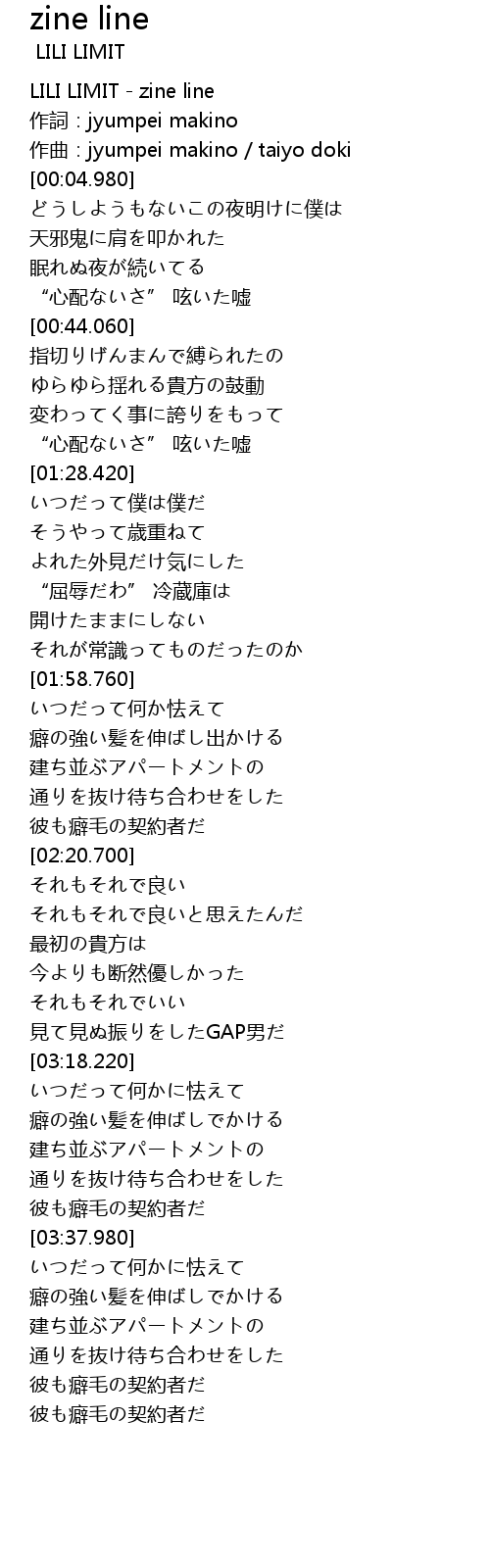 | [00:03.210] | 作曲:jyumpei makino / taiyo doki |