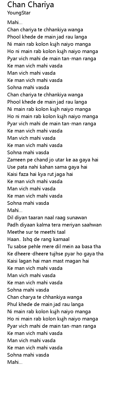 | [01:17.000] | Chan chariya te chhankiya wanga |
