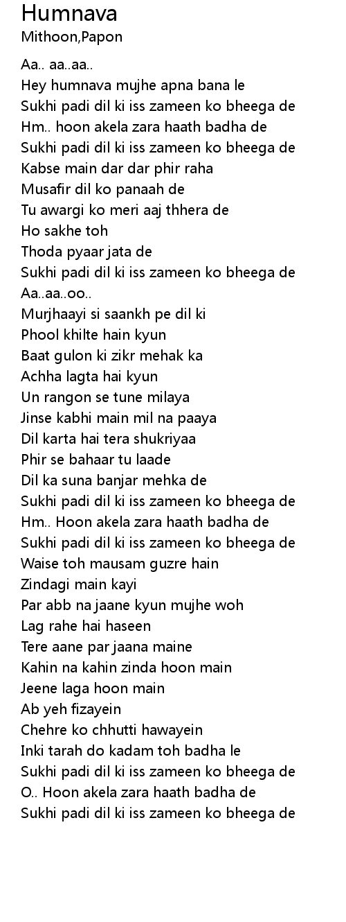 | [00:18.83] | Hey humnava mujhe apna bana le |