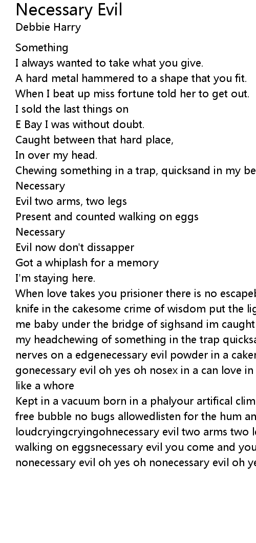When love takes you prisioner there is no escapebut the secret ingriedient is a knife in the cakesome crime of wisdom put the light in my eyes ohyou could find me baby under the bridge of sighsand im caught between that hard place in over my headchewing of something in the trap quicksand in my bed ohnecessary evil nerves on a edgenecessary evil powder in a cakenecessary evil you come you gonecessary evil oh yes oh nosex in a can love in a jarairtight container just like a whore |