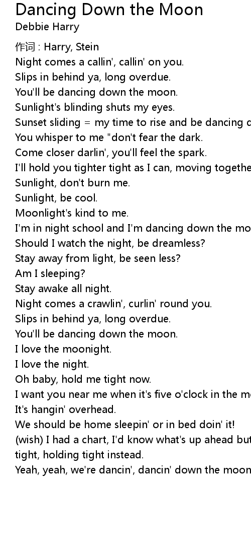 | Yeah, yeah, we' re dancin', dancin' down the moon. |