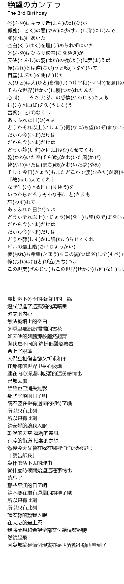 | [03:07.400] | どうかそれ以上(いじょう)何(なに)も望(のぞ)まないと誓(ちか)うよ |