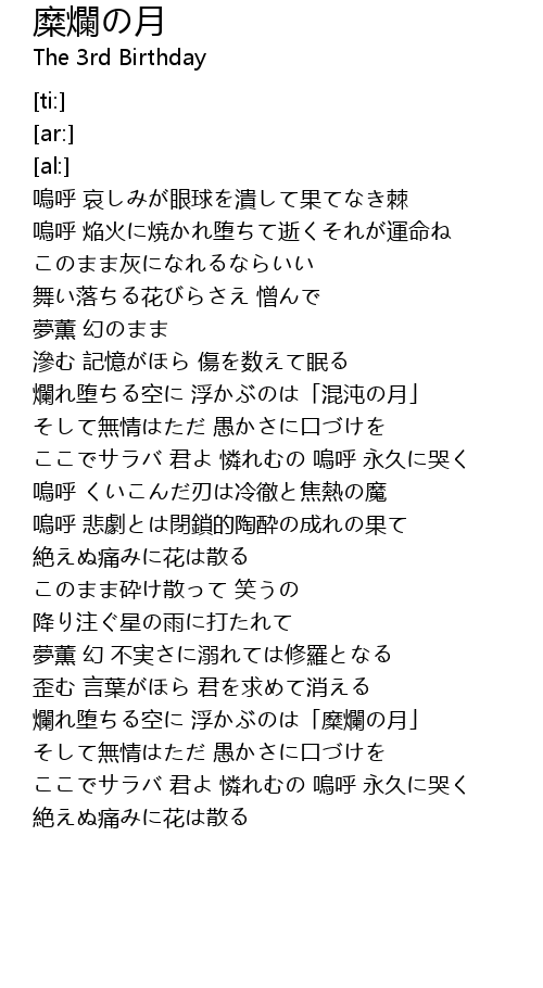 | [03:41.27] | 爛れ堕ちる空に 浮かぶのは「糜爛の月」 |