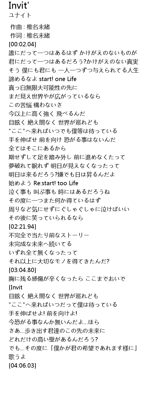 | [01:57.41] | 始めよう Re:start! too Life |