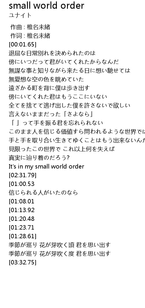 | [03:04.29][01:23.71] | It's in my small world order |