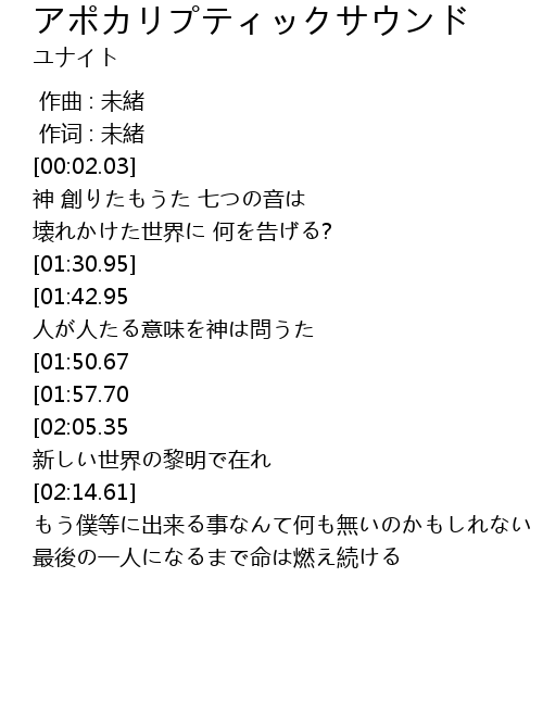 | [03:14.08][01:57.70] | 終わり告げる聖祭? 落日 the world's fate |