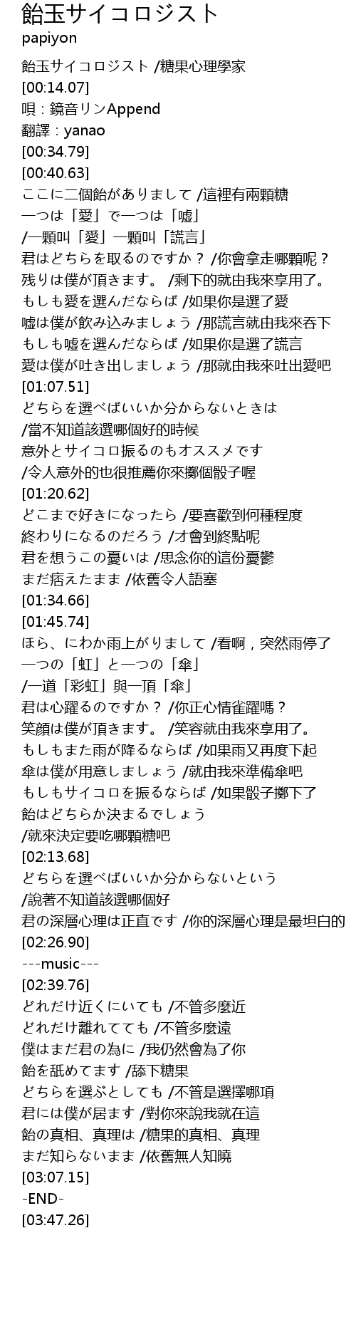 | [00:01.96] | 飴玉サイコロジスト /糖果心理學家 |