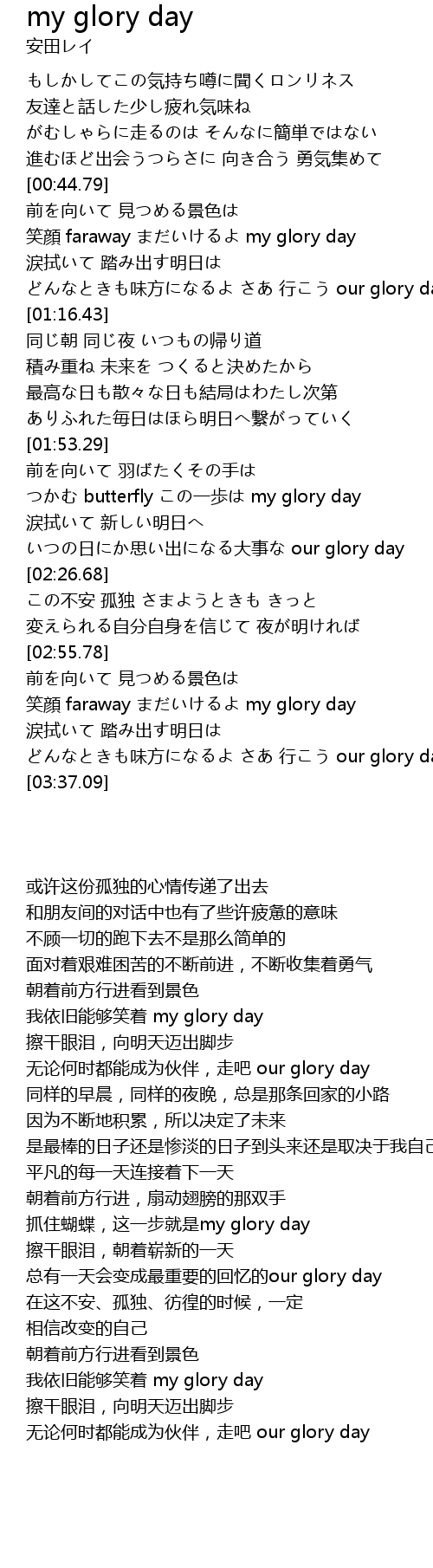 | [02:15.93] | いつの日にか思い出になる大事な our glory day |