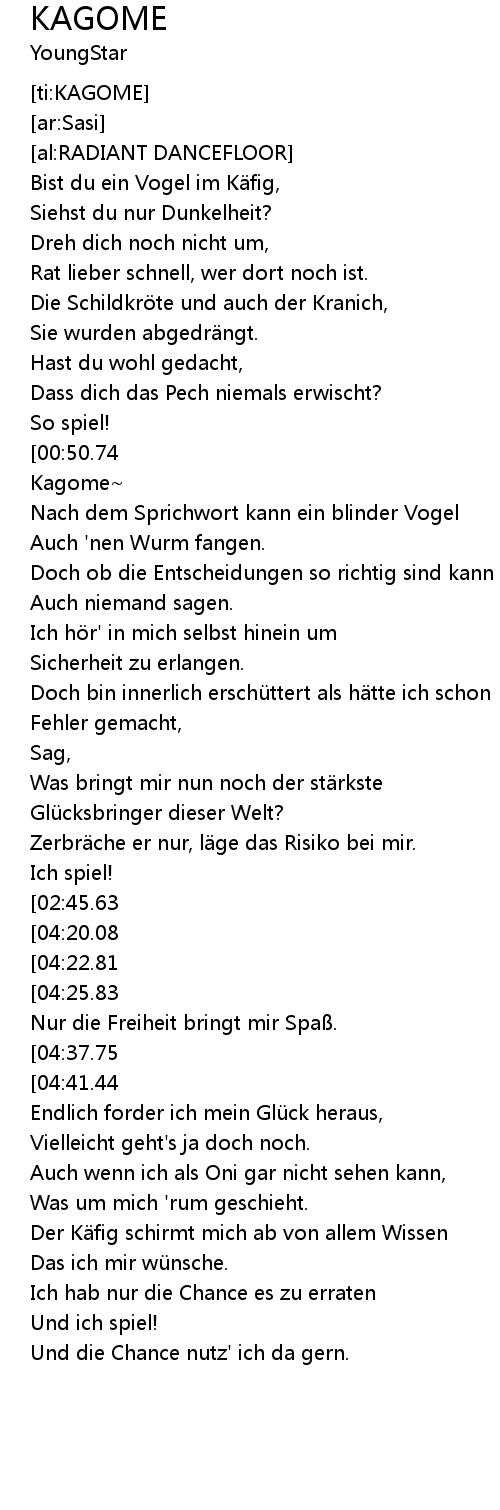 | [03:45.11] | Der Käfig schirmt mich ab von allem Wissen |