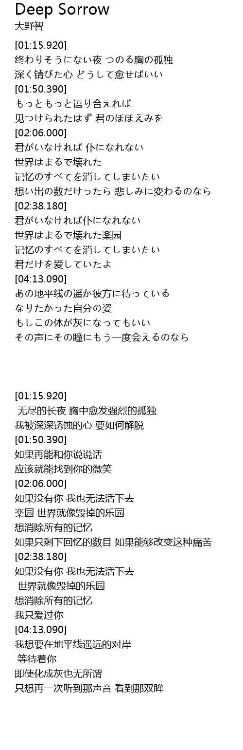 | [01:27.730] | 终わりそうにない夜 つのる胸の孤独 |