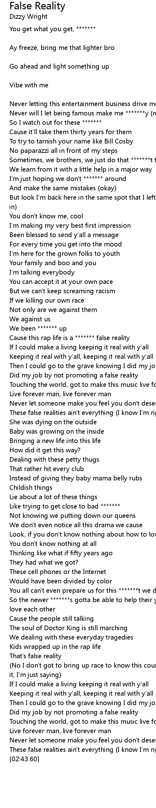 | [01:07.20] | Cause this rap life is a ******* false reality |