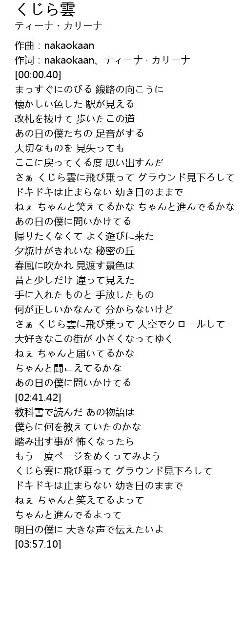 | [03:24.97] | くじら雲に飛び乗って グラウンド見下ろして |