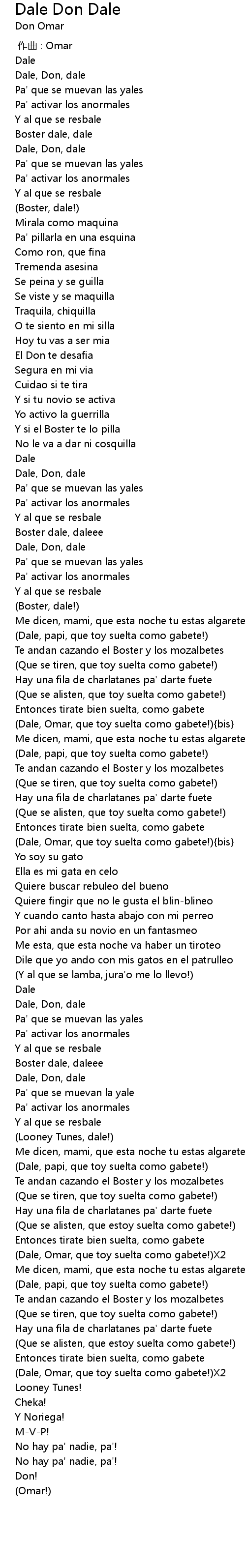 | [01:29.17] | (Dale, Omar, que toy suelta como gabete!){bis} |