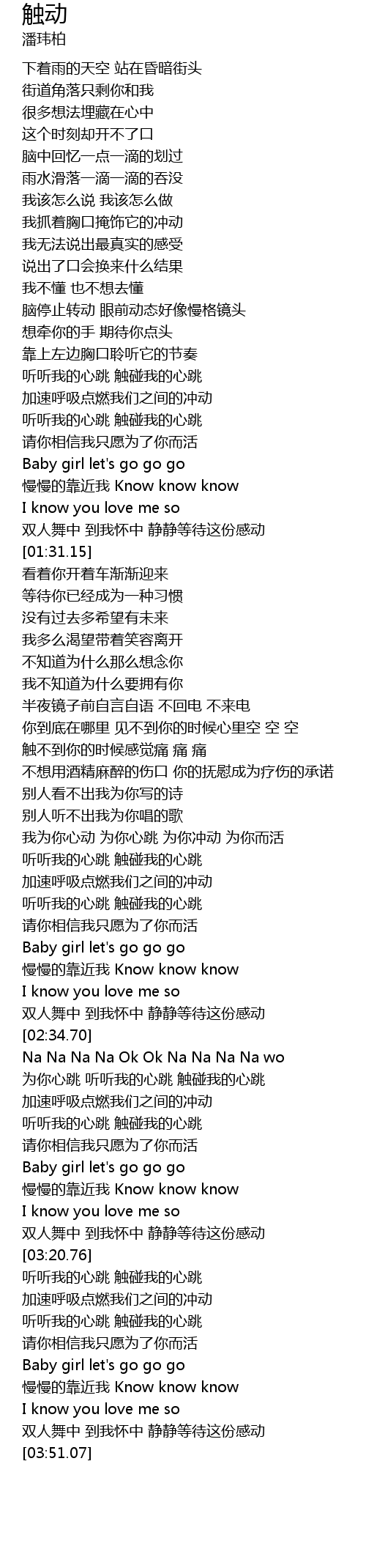 | [02:50.26] | wèi nǐ xīn tiào tīng tīng wǒ de xīn tiào chù pèng wǒ de xīn tiào |
