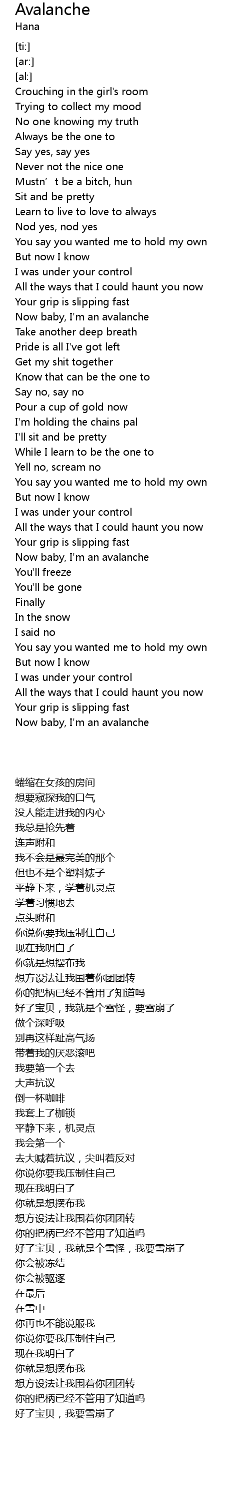 | [02:48.79] | Now baby, I' m an avalanche |