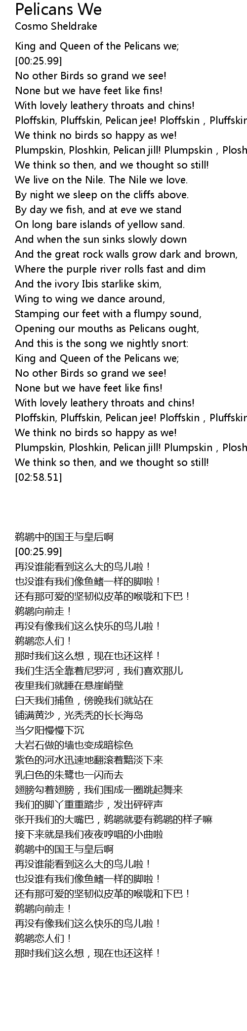 | [02:44.84] | Ploffskin, Pluffskin, Pelican jee! Ploffskin,Pluffskin, |