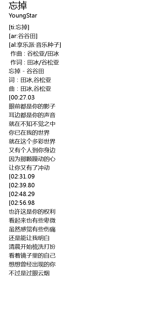| [00:00.12] | 忘掉 - 谷谷田 |
