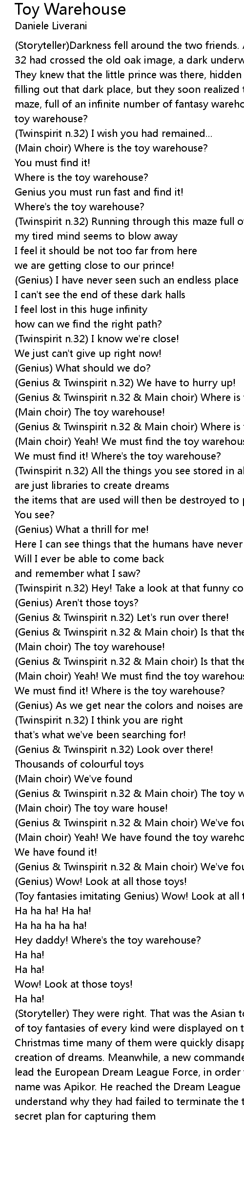 (Genius & Twinspirit n.32 & Main choir) Is that the toy warehouse? |