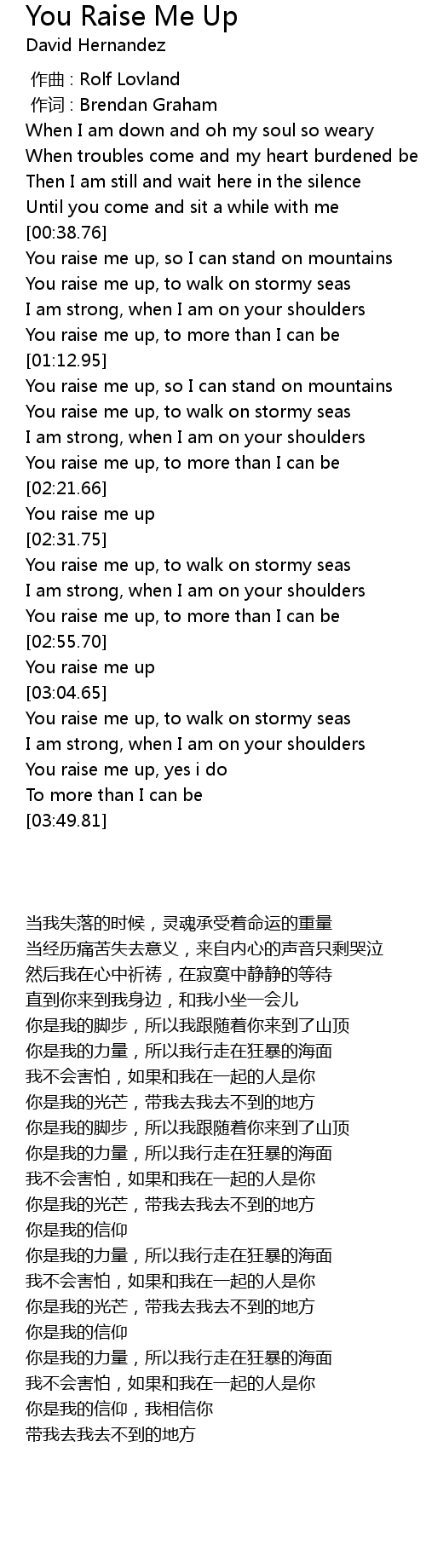 | [02:48.57] | You raise me up, to more than I can be |