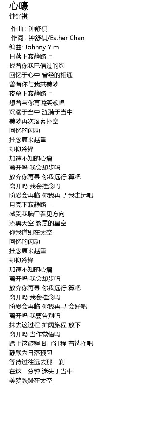 | [00:01.00] | zuò cí : zhōng shū qí Esther Chan |