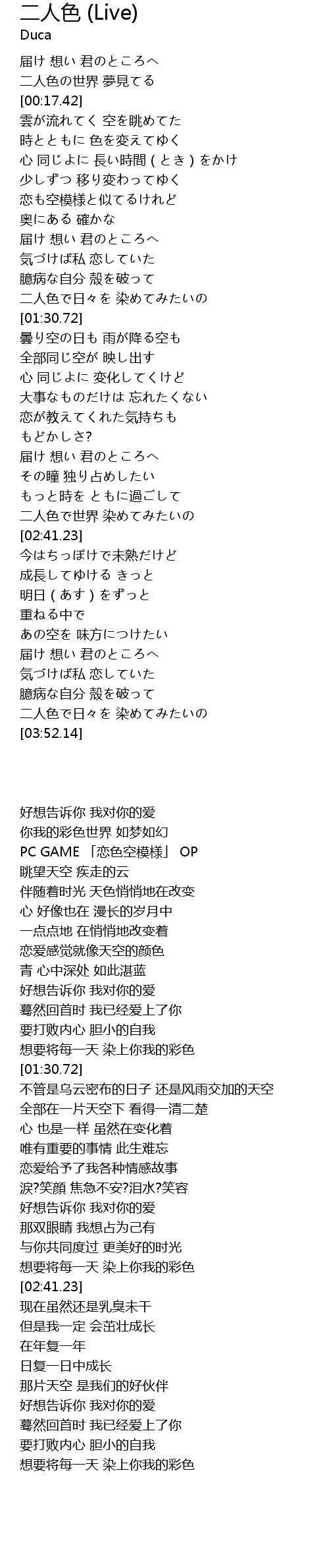 | [03:41.68] | 二人色で日々を 染めてみたいの |