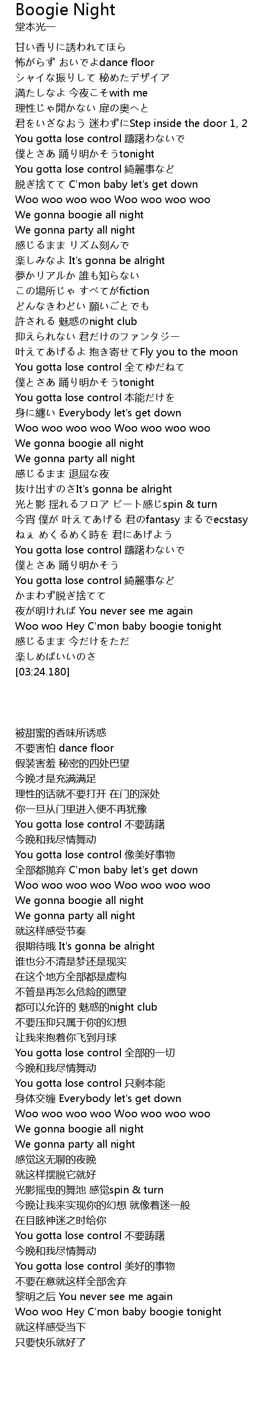 | [03:11.180] | Woo woo Hey C'mon baby boogie tonight |