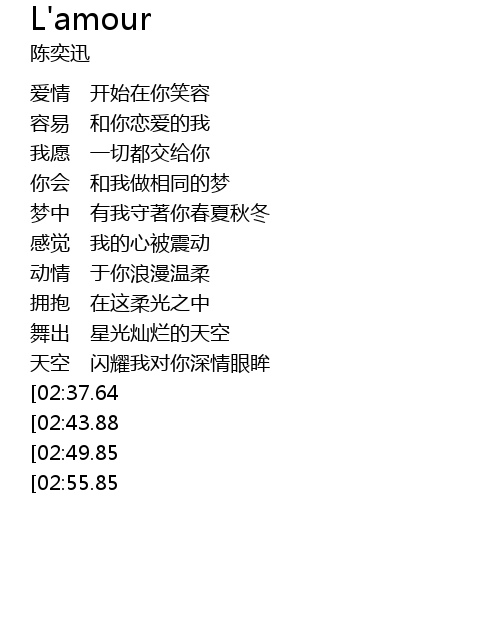 | [03:08.17][02:43.88][01:55.41][01:31.21] | LA' MOUR he ni jin jin xiang yong |