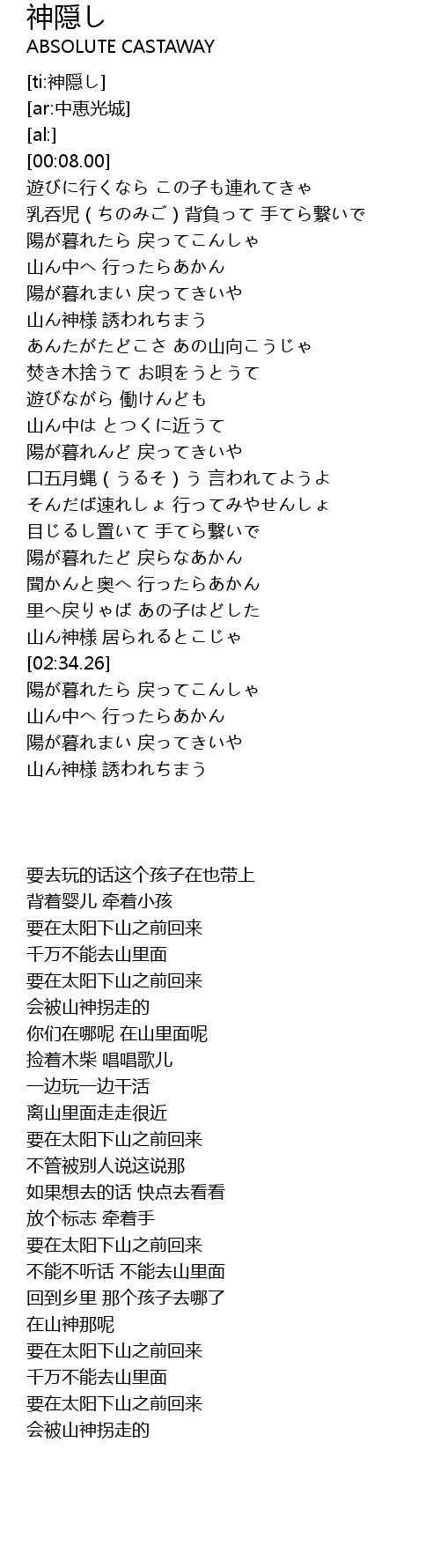 | [03:18.11] | 陽が暮れまい 戻ってきいや |