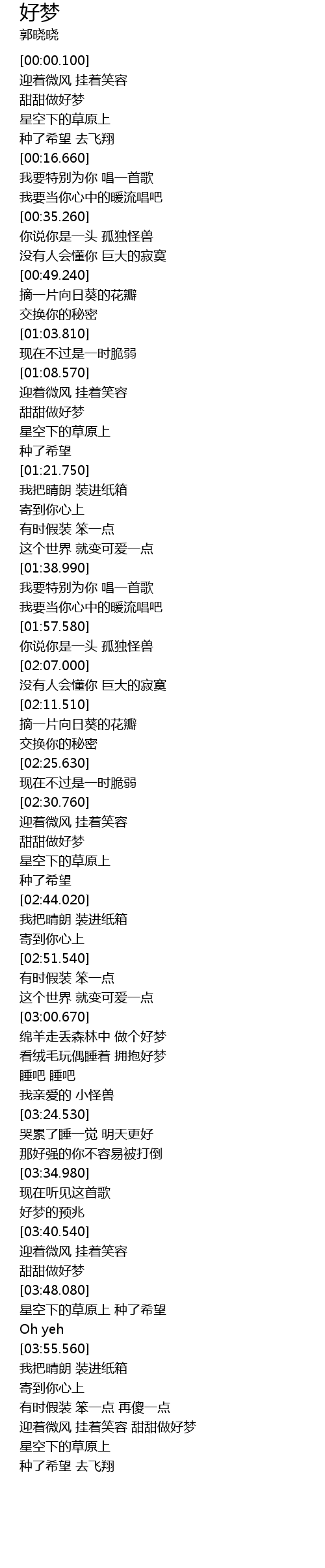 | [04:10.140] | 迎着微风 挂着笑容 甜甜做好梦 |