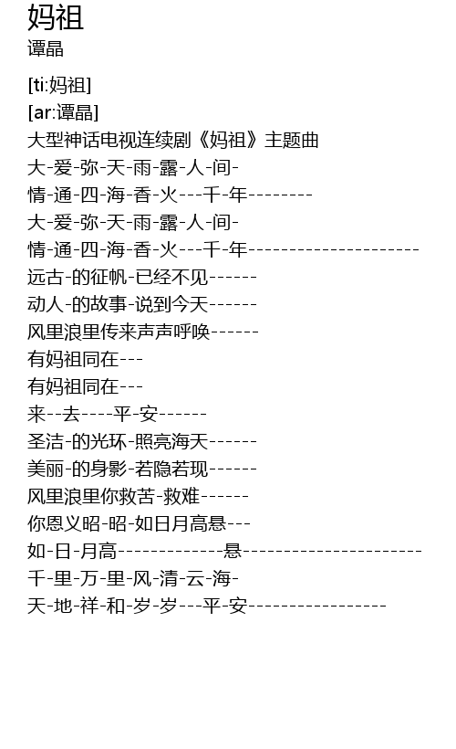 | [00:00.232] | 大型神话电视连续剧《妈祖》主题曲 |