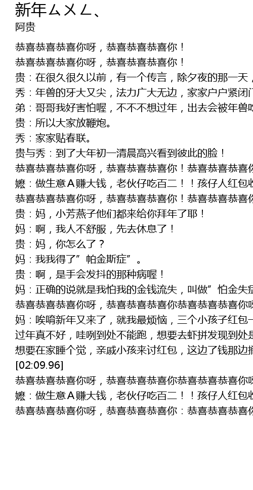 | [01:56.87] | 妈:唉唷新年又来了,就我最烦恼,三个小孩子红包一个不能少, |