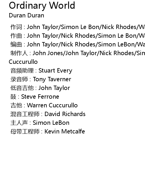 | [00:00.000] | bian qu : John Taylor Nick Rhodes Simon LeBon Warren Cuccurullo |