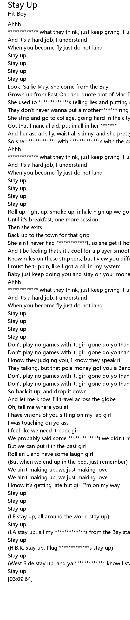 | [03:04.28] | (West Side stay up, and ya ************* know I stay up) |