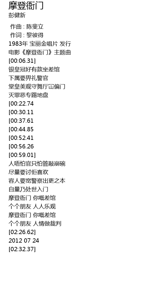 | [01:20.81][00:22.74] | 摩登衙门 你嘅差馆 |