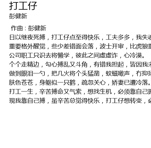 | [00:15.868] | 日以继夜死搏,打工仔点至得快乐,工夫多多,我失魂落魄。 |