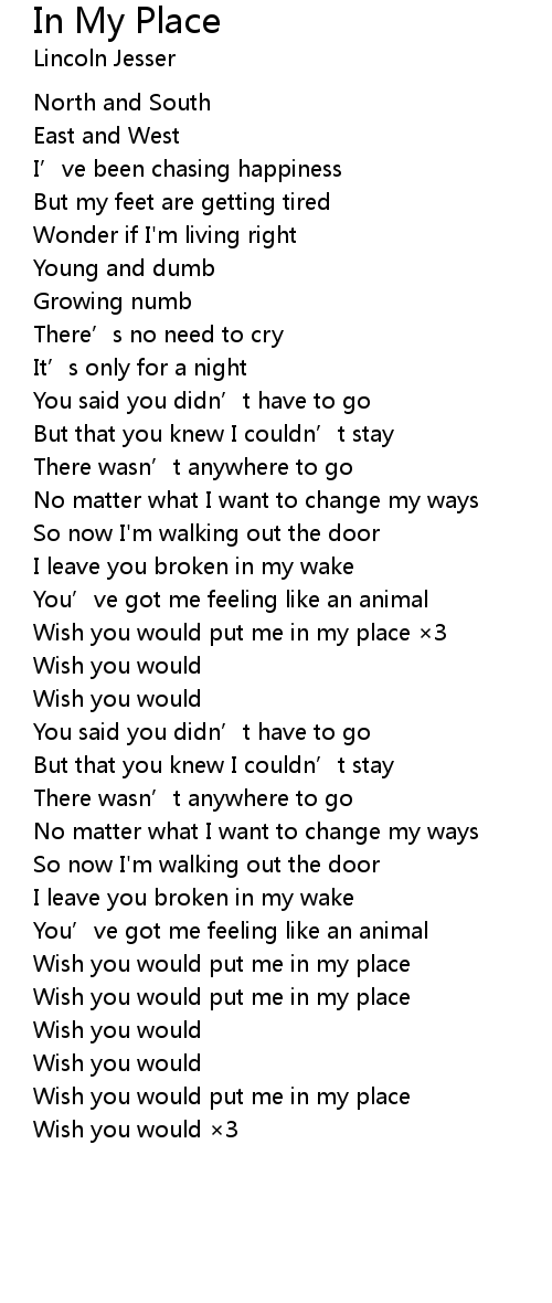 | [01:11.459] | Wish you would put me in my place ×3 |