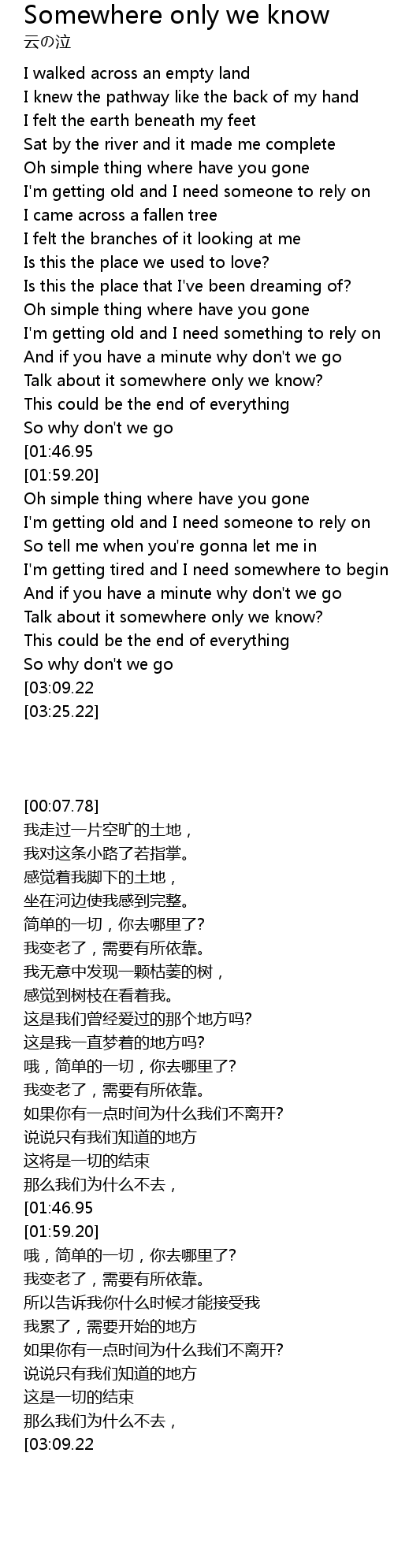 | [01:52.34][01:46.95] | Somewhere only we know? |