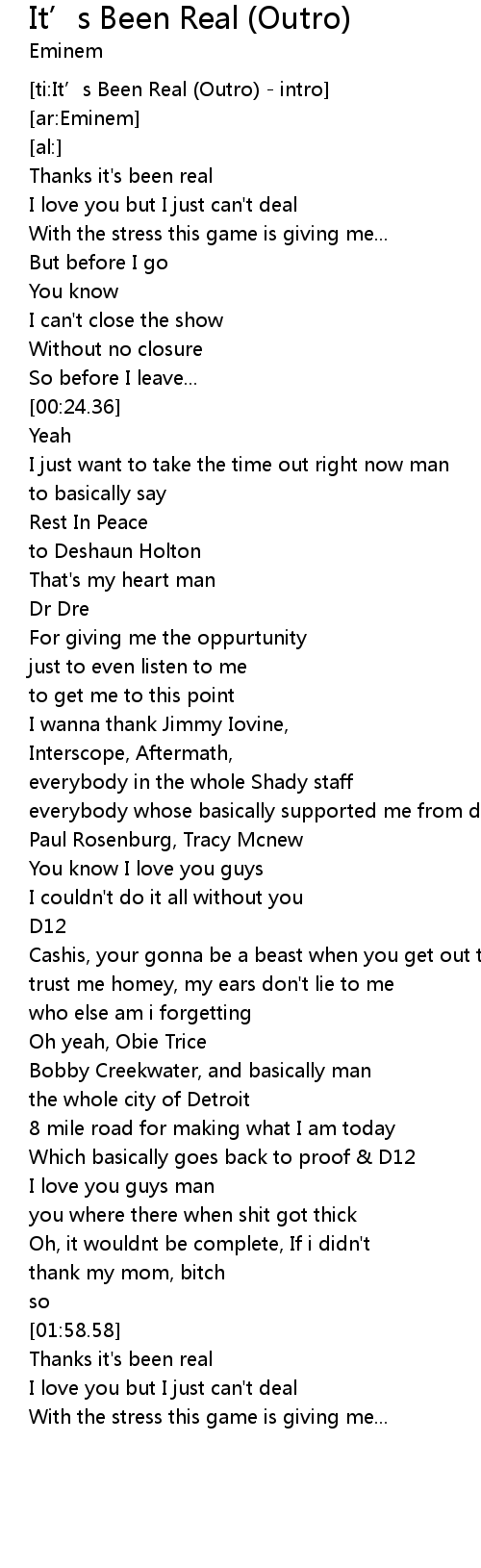 | [ti:It’s Been Real (Outro) - intro] | |